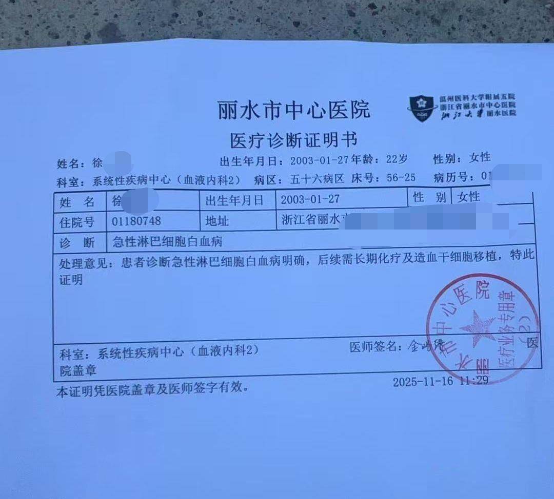 如今,徐某仍在丽水中心医院住院治疗,每天都要输液,反复发烧、咳嗽、头晕、想吐、吃不下饭、浑身无力成为她的日常状态。“还在等杭州的基因报告,要看是不是基因突变才能制定化疗方案。”徐某说,化疗时长因人而异,且需要等身体各项指标稳定后才能开始,目前多项指标仍存在异常。更让她担忧的是骨髓移植——不仅要寻找合适的配型,高昂的费用也让这个贫困家庭望而却步。