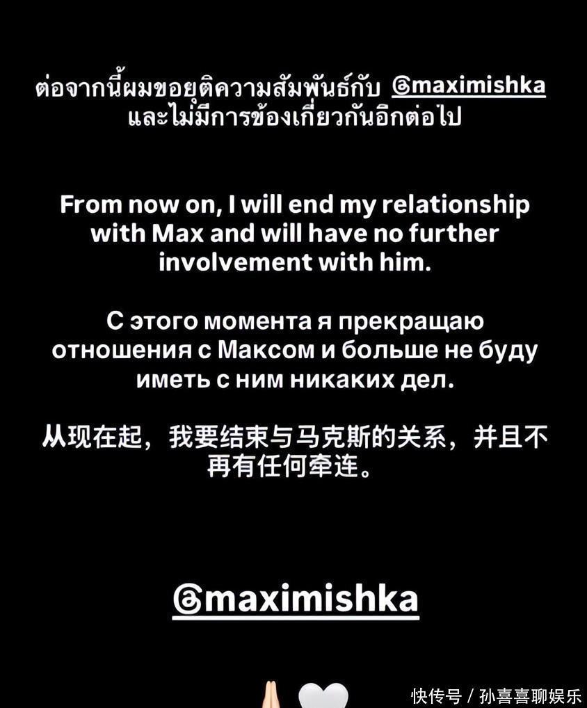 今日,Newyear Kitiwhut在社交媒体上用中、英、泰、俄四种语言发布声明:“从现在起,我要结束与马克斯的关系,并且不再有任何牵连。”