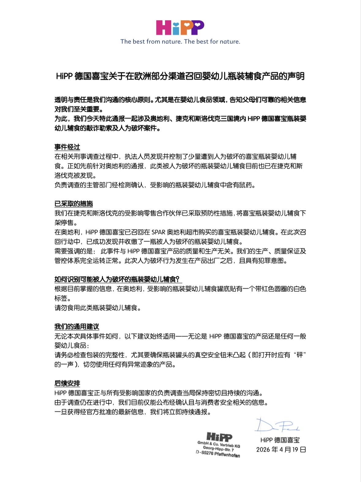 近日,欧洲知名有机婴幼儿食品品牌喜宝(HiPP)因一起涉及产品安全的恶性刑事案件被推到风口浪尖。针对其产品在奥地利、捷克和斯洛伐克被投毒勒索一事,喜宝公司官方发布声明作出紧急回应。