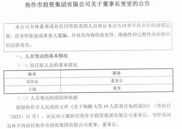 【大河财立方消息】11月7日,焦作市投资集团发布公告称,根据焦作市人民政府文件《关于杨鹏飞等19人职务任免的通知》富瑞众投,决定由王敏担任公司董事长。邹仲春因退休不再担任公司董事、董事长。